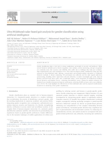 | Palabras Clave: | Gait; Ultra-wide band radar; Gender classification; Spectral features; Feed forward artificial neural network; Ridge classifier; Hist gradient boosting |